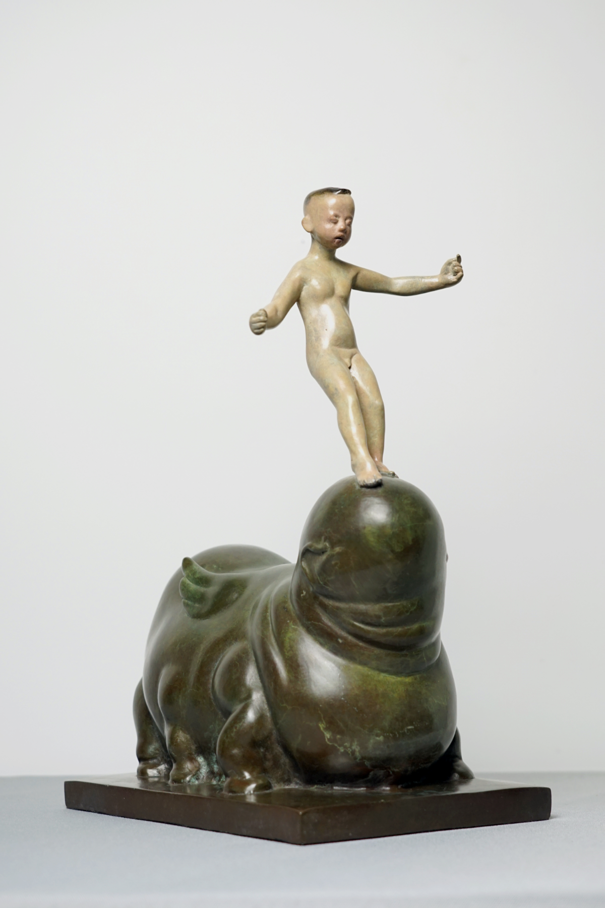 混沌是《山海经》中记载的一个神兽,一个小孩站在混沌头上,双手张开,右脚微微往前探步,像一种朦窦初开的状态,既在极力维持着身体的平衡,又仿佛在寻找着什么。
