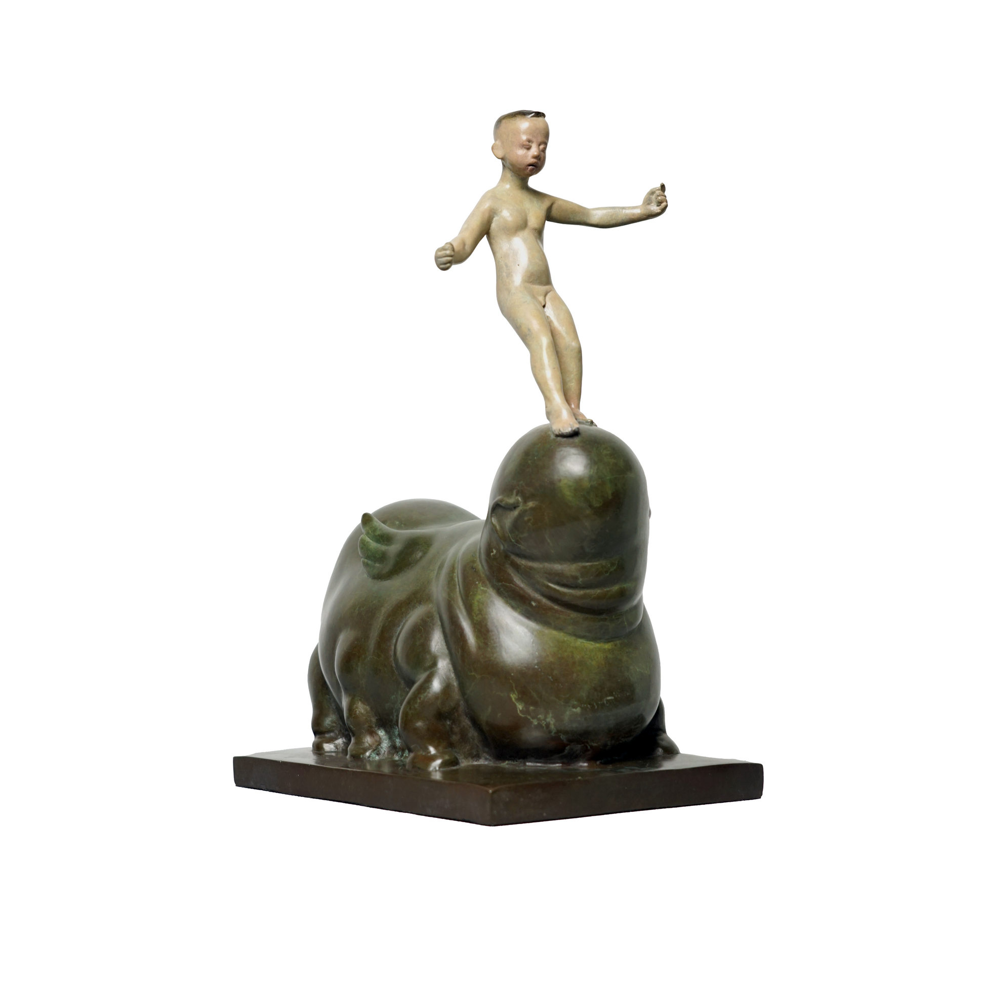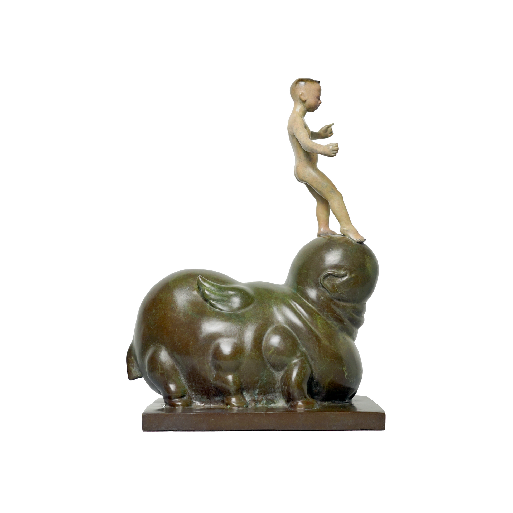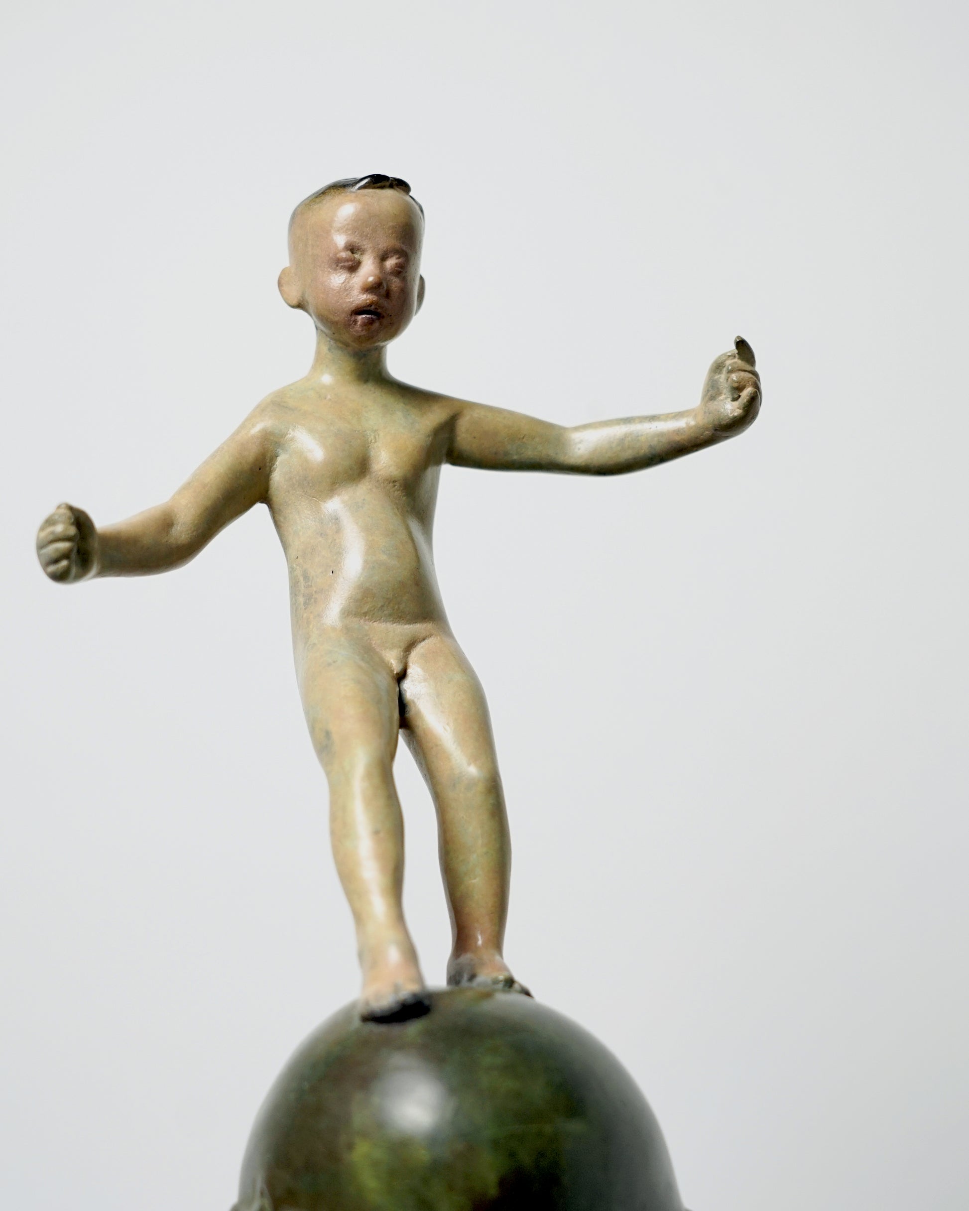 Chaos is a mythical beast recorded in "The Classic of Mountains and Seas" 《山海经》. A child stood on the head of Chaos, with his hands spread out and his right foot stepping forward slightly. This hazy state is trying to maintain the balance of the body, but also seems to be searching for something.
